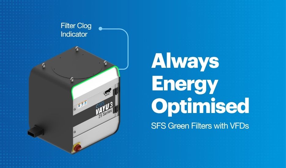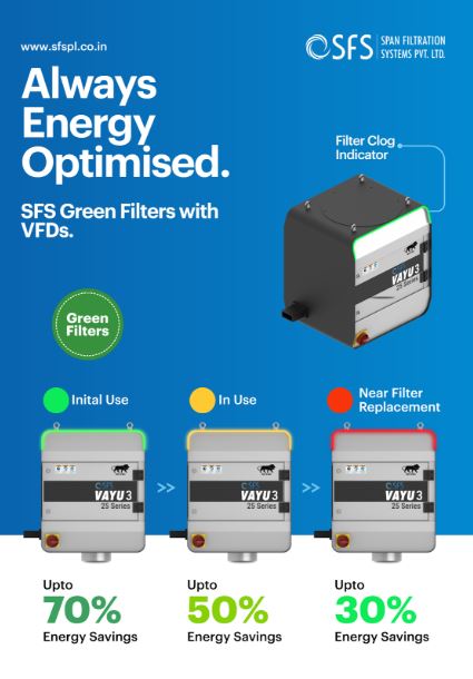 At Span Filtration Systems (SFS), we’ve re-engineered the approach. Our Green Filters, equipped with Variable Frequency Drives (VFDs) and smart airflow control, adapt in real time to process demands—delivering up to 30% savings in energy costs.
