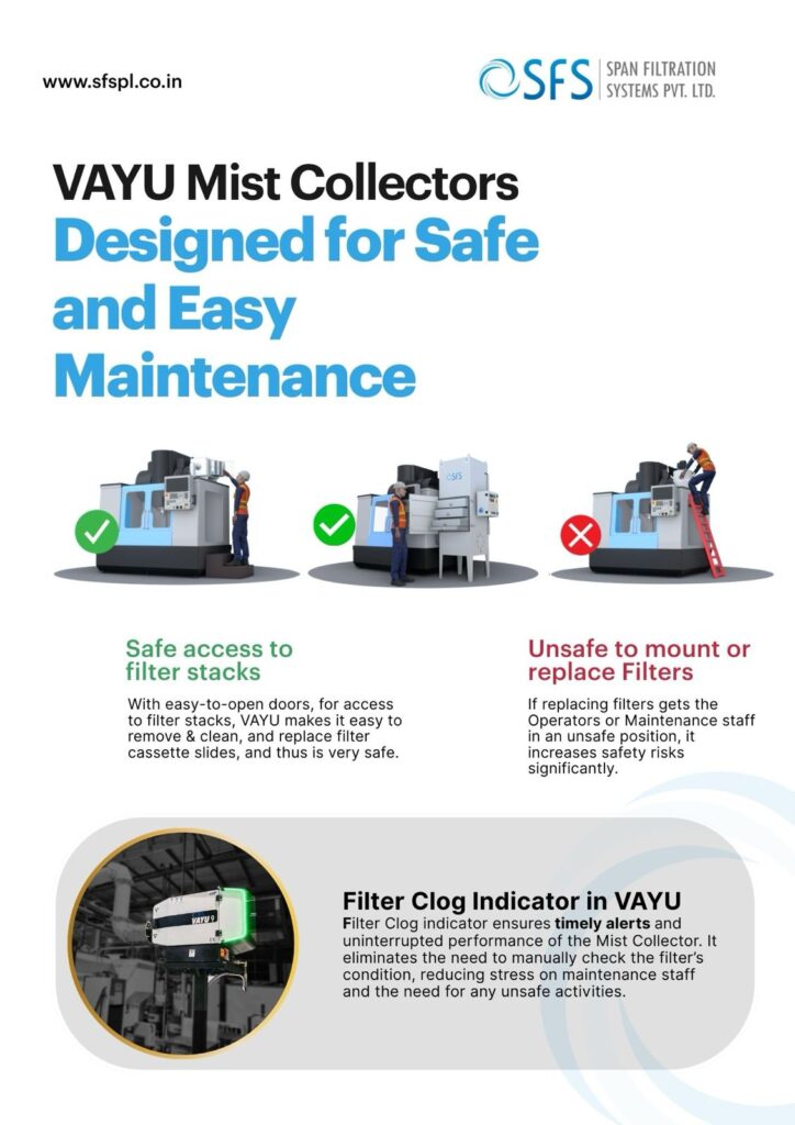 The Vayu 21 Series and Vayu 25 Series Mist Collector, including Vayu 3, Vayu 5, Vayu 9 (Machine or Stand Mounted) and Vayu 9s, Vayu 15 (Floor Mounted, Standalone or Centralised Filters), SFS design prioritises your workforce’s safety and ease of maintenance.